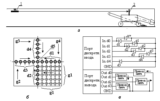 На рис. 48в. представлена структурная схема системы автоматического управления положением датчика (щита) относительно направления лазерного луча. Система выполнена в микропроцессорном варианте. К каждому каналу порта дискретного ввода подключена определенная группа фотодиодов. Так к каналу ввода In d0 параллельно подключены все фотодиоды групп d1 и g4, а к каналу ввода In d1 аналогично подключены фотодиоды групп d2 и g1 и т. д. Только к каналу In d4 единично подключен центральный фотодиод d5.