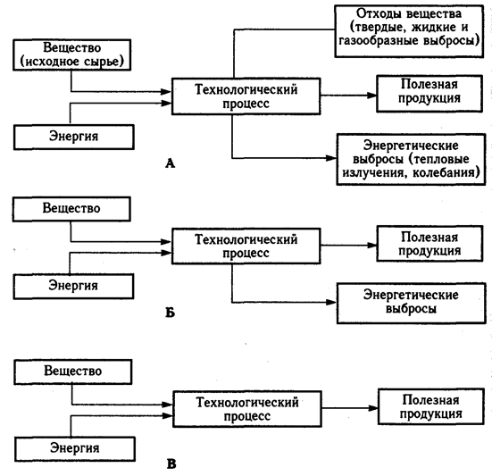 Модели производственных процессов с точки зрения экологии. Любой производственный процесс представляет собой некоторую систему, органически связанную с внешней средой. Такая производственная система получает из окружающей среды исходное сырье, материалы, энергию, а отдает в нее готовую продукцию и всевозможные отходы. Функционирование системы осуществляется благодаря потоку энергии, подводимой извне (электрической, солнечной и т.п.) либо генерируемой внутри системы за счет физико-химических процессов. К отходам относятся все вещества и материалы, тепловые выбросы, физические и биологические агенты, которые попадают во внешнюю среду и в дальнейшем уже не участвуют в получении продукции или энергии.