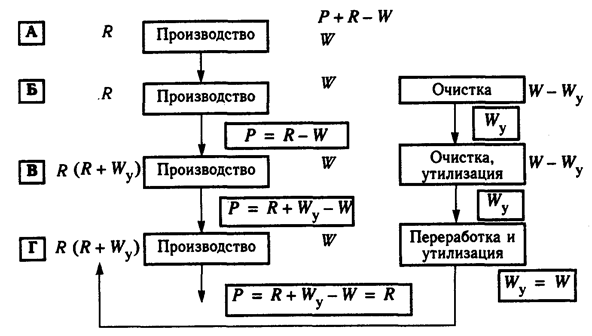 В замкнутом производственном цикле (рис. 10.2, Г) происходит полная переработка и утилизация потока отходов Wy, который вновь возвращается в сферу производства. Здесь потоки Wи Wy количественно равны, а поток готовой продукции Р соответствует потоку R.