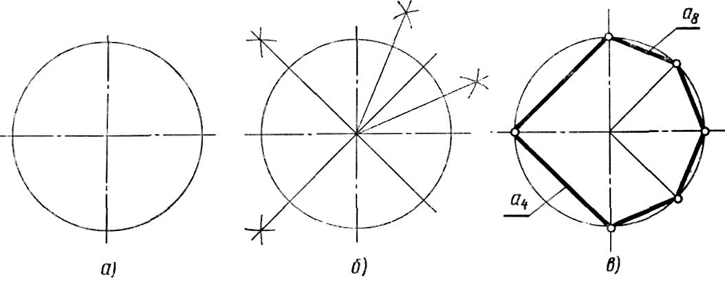 Для деления окружности пополам достаточно провести любой еедиаметр. Два взаимно перпендикулярных диаметра разделят окружность на четыре равные части (рисунок 28, а).Разделив каждую четвертую часть пополам, получают восьмые части, а при дальнейшем делении – шестнадцатые, тридцать вторые части и т. д. (рисунок 28, б).Если соединить прямымиточки деления, то можно получить стороны правильного вписанного квадрата(а4), восьмиугольника (а8) и т. д. (рисунок 28, в).