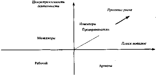 Основные различия между предпринимателем и менеджером по их ведущим психологическим качествам легко обозначить с помощью двумерной модели Дж.Ронена, иллюстрация которой приводится на рис.4. В модели представлен континуум принятия решения в условиях неопределенности. На его нижней точке (экстремуме) находится рабочий, задачи которого характеризуются минимальной неопределенностью. На другом конце - инновационный предприниматель. Вдоль континуума - наиболее изменяющаяся характеристика- поиск новизны (novelty seeking). Другую ось составляет целеустремленность (purposefulness) деятельности предпринимателя. Очень близкие позиции на диаграмме заняли предприниматели и инвенторы. Иногда эти фигуры представлены в одном лице, но чаще инвентор проявляет креативность, упорство и настойчивость в решении какой-то своей новаторской проблемы, а предприниматель - в ее продвижении, в практической реализации открытия; он основывает дело и, таким образом, доводит задумку до конца. Все это требует особой активности и целеустремленности поведения.