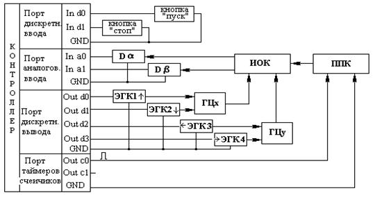 Как и прежде, основу такой системы составляет микропроцессорный контроллер с портами аналогового и дискретного ввода, а так же с портами дискретного и импульсного вывода. К порту дискретного ввода подключены кнопки «пуск» и «стоп», а к порту аналогового ввода подключены датчики Dα и Dβ углового перемещения исполнительного органа комбайна. К порту дискретного вывода подключены исполнительные электрогидроклапаны ЭГК1, ЭГК2, ЭГК3, ЭГК4, с помощью которых происходит управление угловым положением исполнительного органа комбайна (ИОК). Для внедрения фрезы в забой включают на заданное время привод механизма подачи комбайна (ППК). Время внедрения контролируется таймером контроллера.