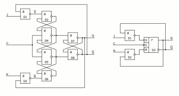 Если на входы J и К подать взаимно противоположные уровни, то при подаче перепада напряжения на вход С выходы JK-триггера устанавливаются в такие же состояния. При подаче на входы J и К одновременно напряжений высокого уровня триггер переключается в состояние, противоположное предыдущему, если на вход синхронизации С подать перепад напряжения.