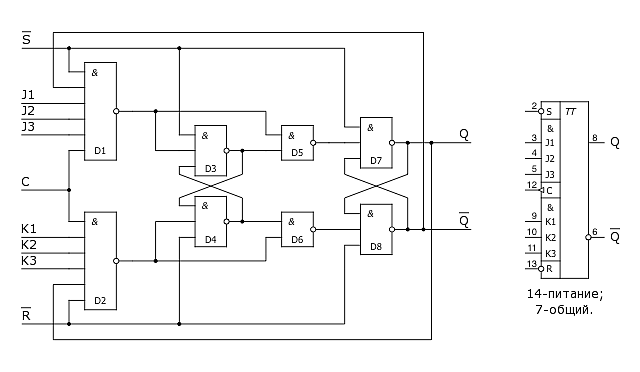 Рис. 2.51. Комбинированный JK-триггер - структура микросхемы, условное обозначение и цоколевка микросхемы ТВ1.