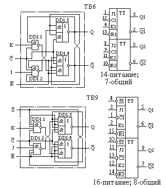Микросхемы ТВ6 и ТВ9, ТВ10 и TB11 содержат по два JK-триггера с общим выводом питания (рис. 2.52).