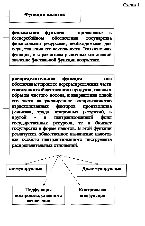 Налоги выполняют две основные функции – фискальную и распределительную (см.: схема 1). В налоговом регулировании имеются три подфункции: а) стимулирующая, которая направлена на развитие определенных социально-экономических процессов, реализуется через систему льгот, исключений, преференций (предпочтений), увязываемых с льготообразующими признаками объекта налогообложения. Она проявляется в изменении объекта обложения, уменьшении налогооблагаемой базы, |понижении налоговой ставки;