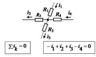 Первый закон Кирхгофа является следствием закона сохранения заряда, т.е. приходящий за определенное время к узлу заряд, равен заряду, уходящему за то же время от узла. Следовательно, заряд в узле не накапливается и не расходуется. Таким образом, первый закон Кирхгофа имеет следующую формулировку: алгебраическая сумма токов в ветвях, сходящихся в узле, равна нулю. В дальнейшем будем в уравнениях, составленных по первому закону Кирхгофа, считать токи, направленные к узлу отрицательными, а токи, направленные от узла положительными.