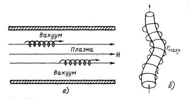 Если пропустить через плазму в форме столба вдоль его оси сильный электрический ток, то магнитное поле этого тока, которое имеет форму, обычную для прямолинейного проводника, создает электродинамические силы, которые будут стремиться сжать плазменный столб. Таким образом столб плазмы окажется оторванным от стенок и стянутым в плазменный шнур. Очевидно, что сжатие плазмы может происходить до тех пор, пока давление, вызванное электродинамическими силами, не уравновесится газокинетическим давлением частиц самой плазмы. На рисунке шнур 2 изолирован от стенок 1 магнитным полем Н. Электрический ток 1, пропущенный через газ, выполняет несколько функций: а) в начальной стадии создает плазму благодаря интенсивной ионизации; б) стягивает плазму в шнур; в) за счет выделения джоулева тепла и сжатия нагревает плазму до высокой температуры.